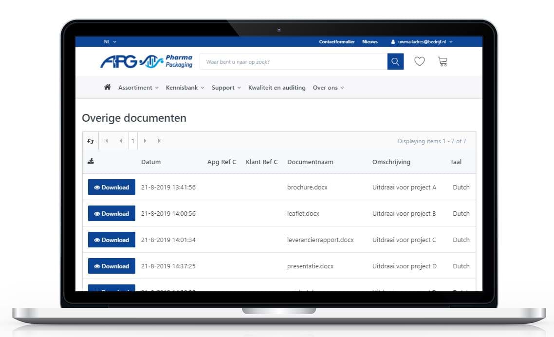 Bij het aanvragen van prijzen voor specifieke artikelen, aantallen en plaats van levering ontvangt u van APG Europe een gedetailleerde offerte. Alle offertes die aan u en uw organisatie zijn uitgebracht vindt u terug onder 'Offertes' binnen de module Transacties.